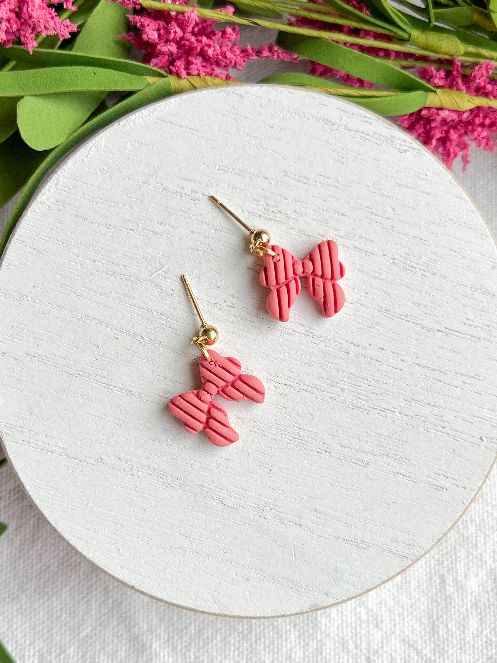 Embrace your inner coquette with these charming, handmade pink ribbed bow earrings! These lightweight polymer clay dangles are the perfect blend of playful and sophisticated. Featuring a unique "ribbed" texture that mimics real grosgrain ribbon, these bows add a soft, feminine touch to any outfit—from a casual brunch look to a preppy office ensemble.