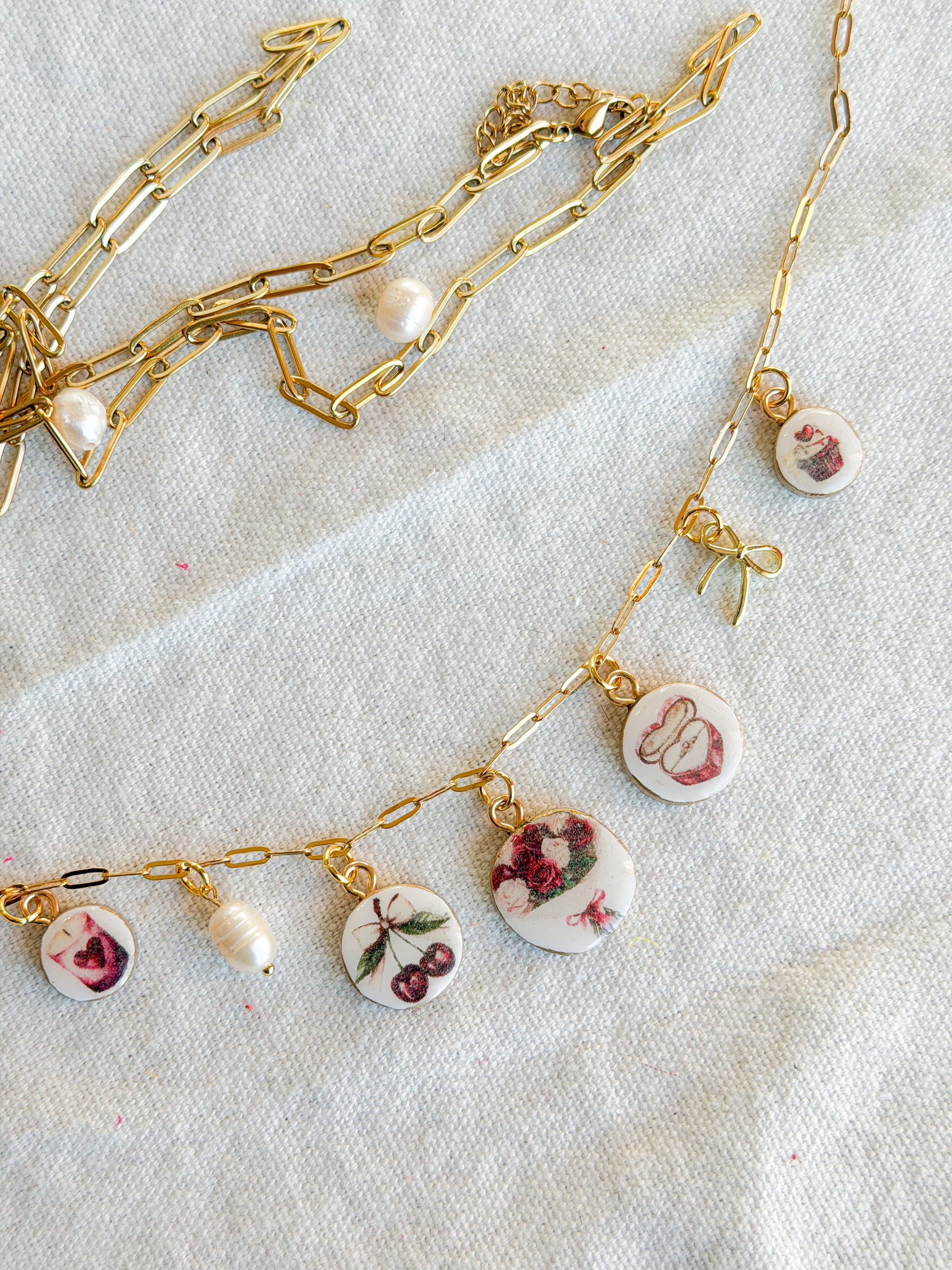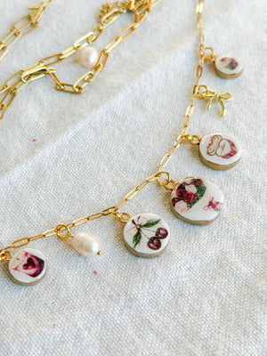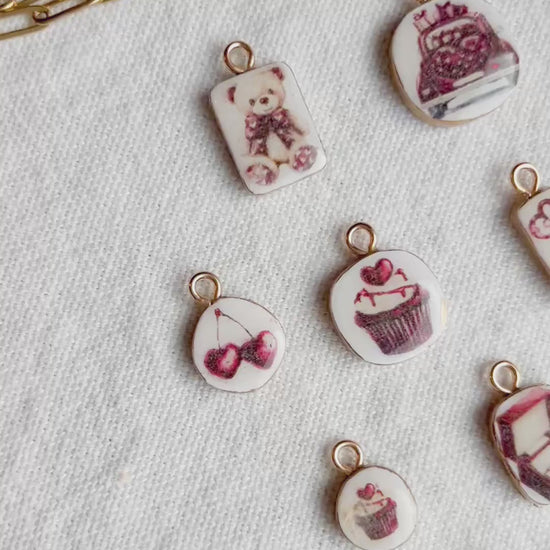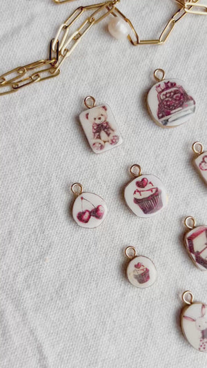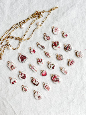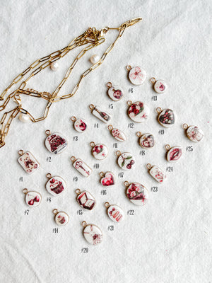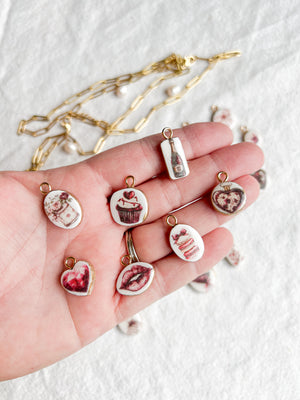 These handmade polymer clay necklace charms capture the romance of vintage florals, sweet treats, love notes, and dreamy Parisian details. Each charm features delicate blush, rose, and berry-toned illustrations reminiscent of café dates, flower markets, and handwritten love letters tucked into a journal. Every charm is individually handcrafted from polymer clay, sealed for durability, and finished with a gold (or silver)-tone loop—perfect for creating necklaces, bracelets, charm bars, or layering into your own custom jewelry designs. No two charms are exactly alike, making each piece feel personal and special.