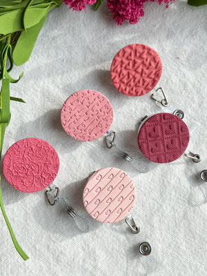 Add a little love to your workday with these handmade polymer clay badge reels. Each round badge topper features a unique heart-inspired texture in shades of pink and rose, making every piece one of a kind. Designed to be both cute and functional, these badge reels are perfect for nurses, teachers, office staff, and anyone who wears an ID daily.